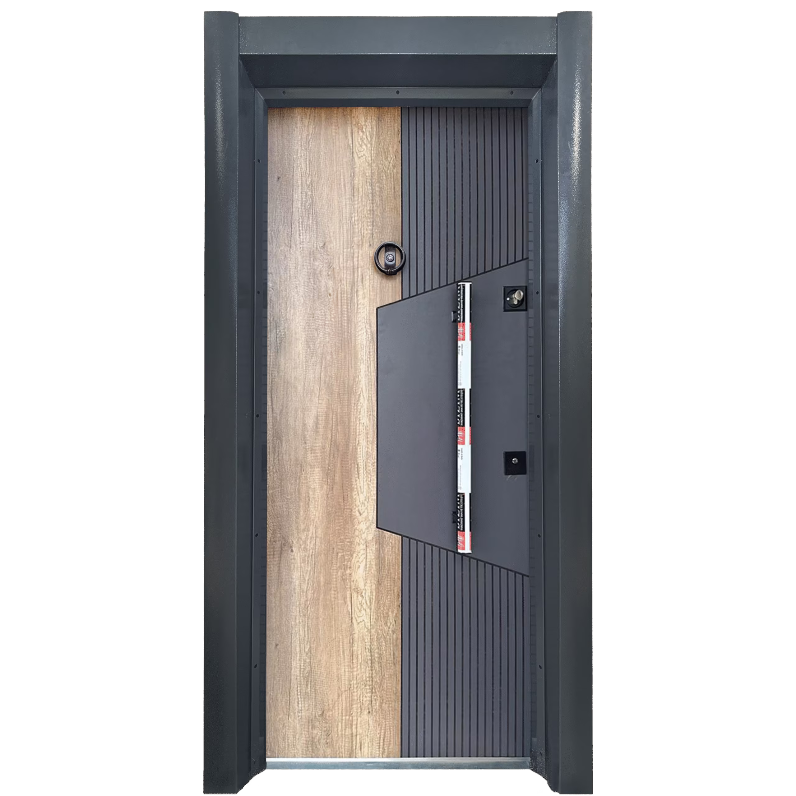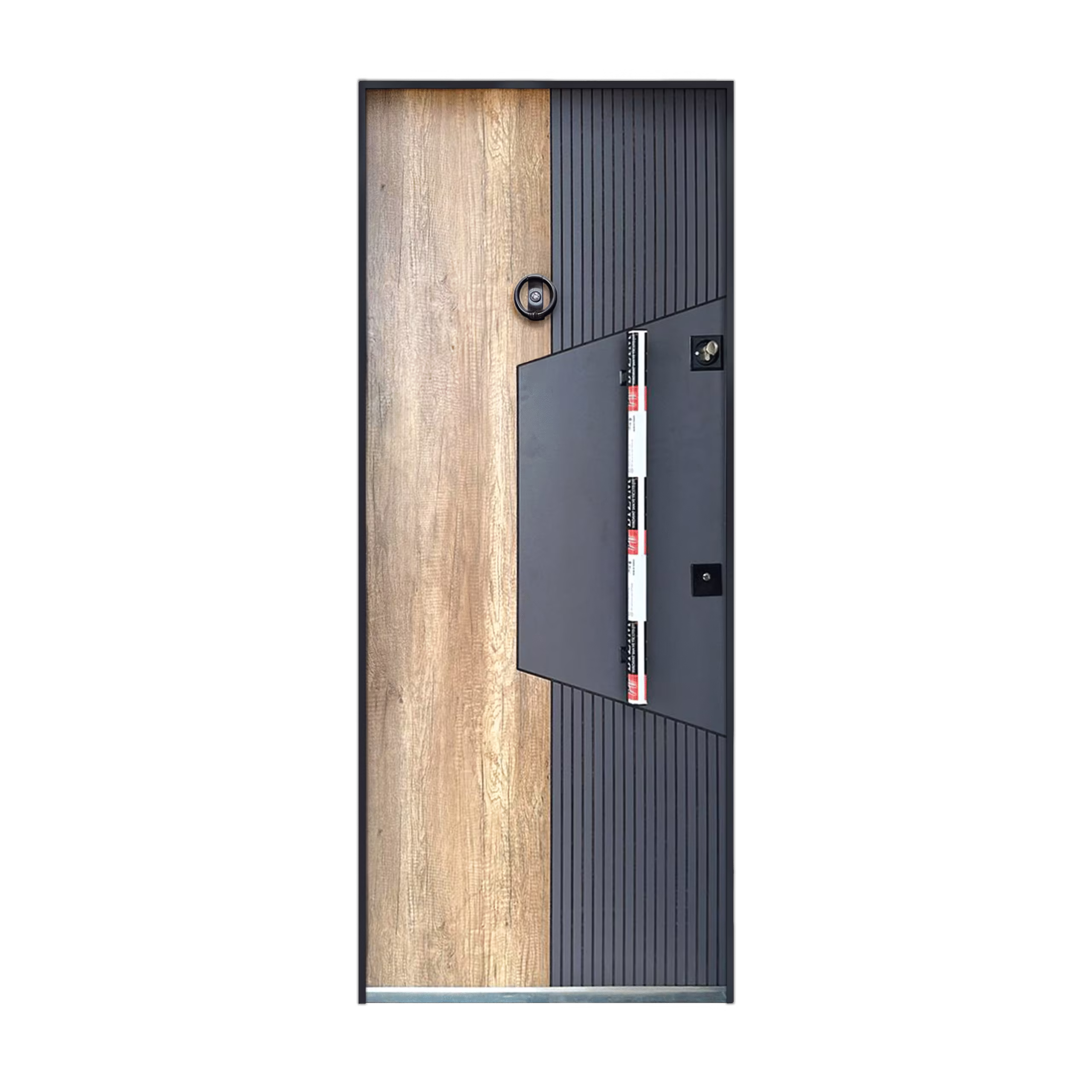 La Porte Blindée Fusion est un modèle qui sort du lot. Avec son design asymétrique combinant un panneau bois clair stratifié et un insert en gris métallique rainuré, elle incarne l’équilibre parfait entre chaleur naturelle et modernité industrielle.