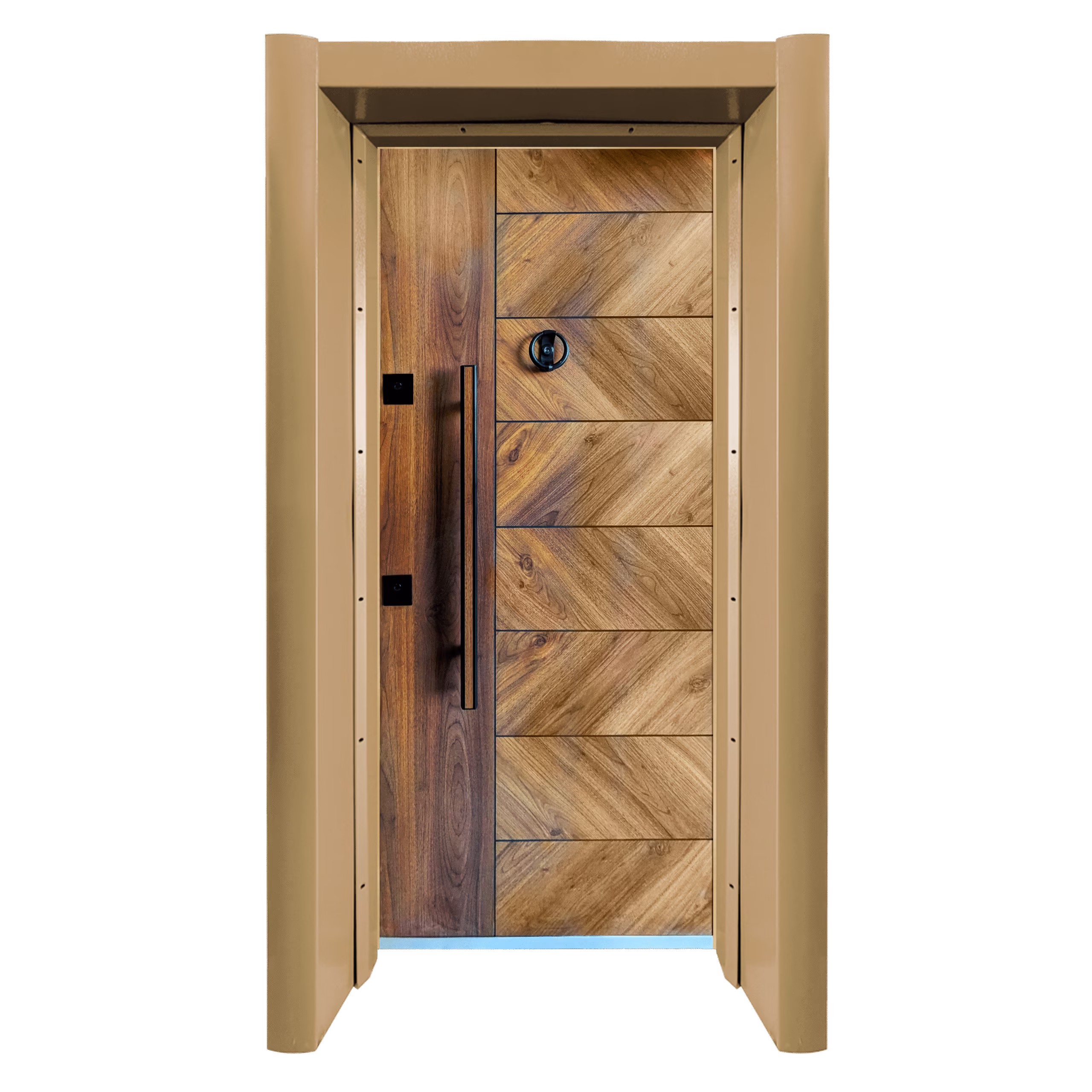 Avec sa finition bois doré en panneaux horizontaux et son cadre élégant, Le Chêne Doré illumine votre entrée tout en garantissant une sécurité fiable.